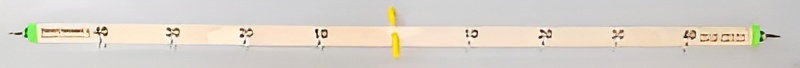Рычаг представляет собой линейку длиной 800 мм, на которую нанесена оцифрованная шкала. Под оцифровкой через каждые 5 см на линейке установлены крючки для подвешивания грузов. На торцах линейки имеются винты с балансировочными гайками, в середине – отверстие для оси.