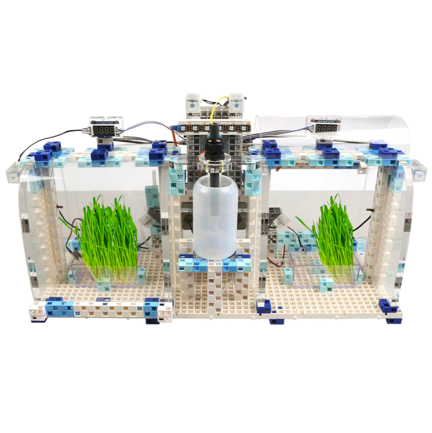 В собранном виде набор представляет собой настольную модель теплицы с двумя внутренними отсеками, на внешней стороне которых монтируется микрокомпьютер, контролирующий параметры модели и управляющий исполнительными механизмами, а также датчики и оборудование, согласующее разные узлы системы. Каждый отсек оборудован датчиками света, температуры и влажности почвы.