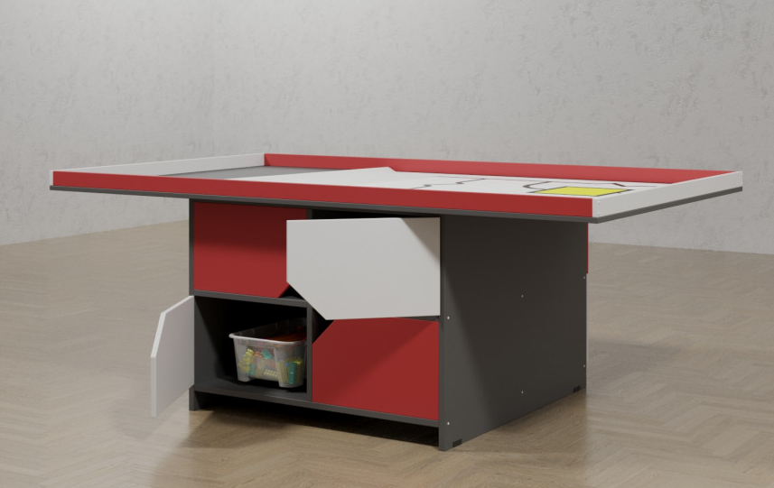 Перед вами замечательный стол для роботостроения, который сделает процесс взаимодействия малыша с роботами проще и удобнее. Специальная конструкция стола позволяет удобно разместить на его поверхности все нужные элементы, при этом сохранив необходимое свободное пространство. Столешница довольно большая и просторная. Это позволит детям чувствовать себя свободно в движениях при конструировании. Бортики столешницы приподняты для того, чтобы малыш случайно не уронил детали на пол. Также у стола имеются четыре вместительных ящика, в которых могут хранится необходимые для работы материалы, пособия, детали и игрушки. Это позволит не заваливать столешницу всем подряд и поддерживать порядок на столе. Интересные цвета и прекрасное качество сборки поможет детям по полной наслаждаться процессом конструирования любимых роботов.