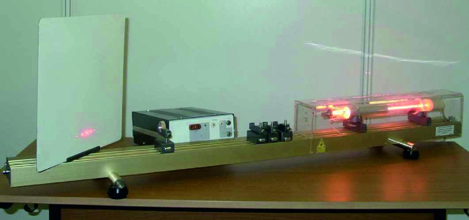 Установка представляет собой наиболее распространенный гелий-неоновый лазер с блоком питания. Наличие оптической скамьи и набора оптических элементов позволяют демонстрировать следующие физические явления: