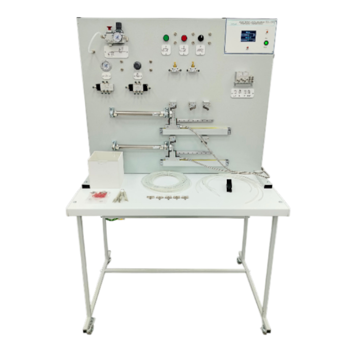 Учебный комплект рассчитан на обучение основам управления пневмоприводами. Элементы пневмоавтоматики жестко закреплены на центральной панели комплекса с целью сокращения времени на монтаж, сохранности элементов и защиты от вандализма. Демонтаж элементов осуществляется только при разборке стенда.