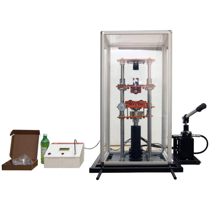 Экспериментальная часть состоит из силовой рамы с устройством механической нагрузки образцов гидравлическим домкратом с усилием не менее 30 кН, неподвижной траверсы с приспособлением для установки образцов, прецизионным микрометром часового типа с точностью измерения перемещения подвижной траверсы не хуже 0,1 мм, прозрачного защитного кожуха, а также экспериментальных образцов.