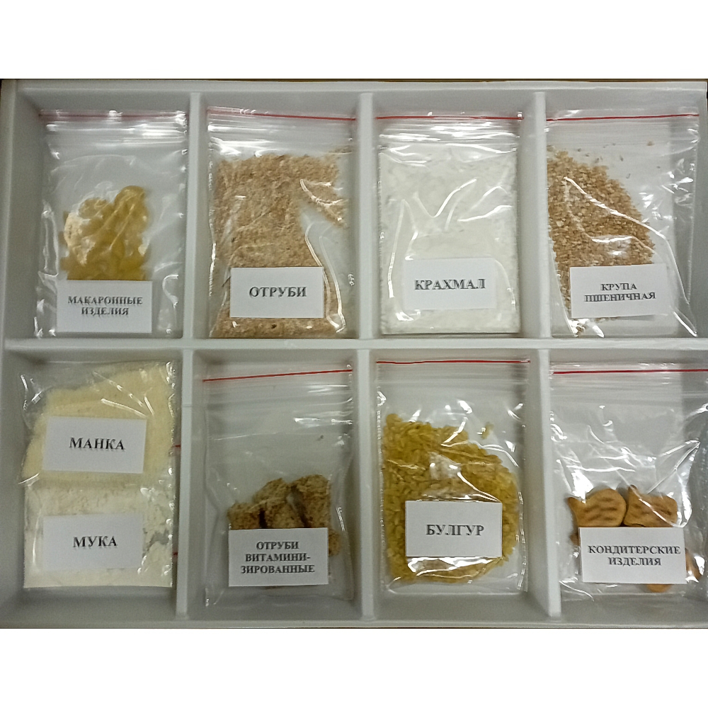 Образцы продуктов переработки пшеницы представлены следующими наименованиями: булгур, крахмал, крупа пшеничная, манная крупа, отруби, отруби витаминизированные, мука, макаронные изделия, кондитерские изделия. Коллекция упакована в коробку.